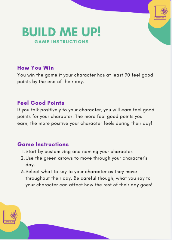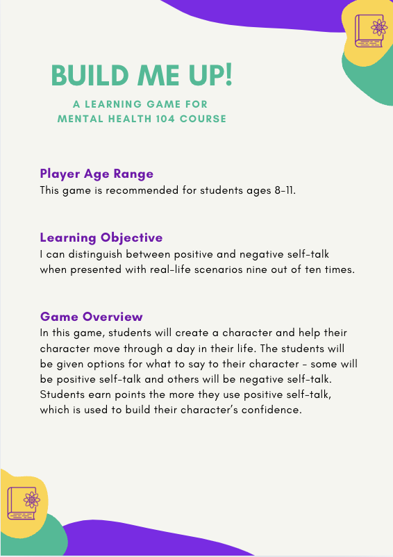 To meet this need, I designed Build Me Up!, an eLearning game that could accompany counseling lessons. Using Canva, I developed a printable Game Guide that provided everything educators needed to run the activity with their students.