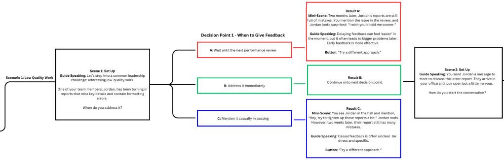 I designed this scenario-based learning experience that allows managers to practice real workplace conversations and see the impact of their choices in real time. Instead of passive tips or scripts, learners step into two realistic situations, low-quality work and team breakdowns, and choose how to respond at key decision points.